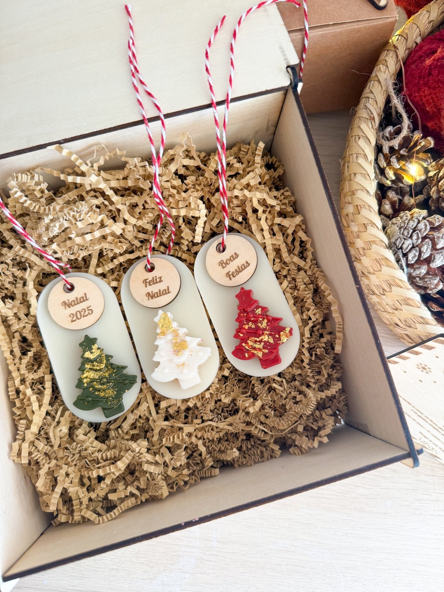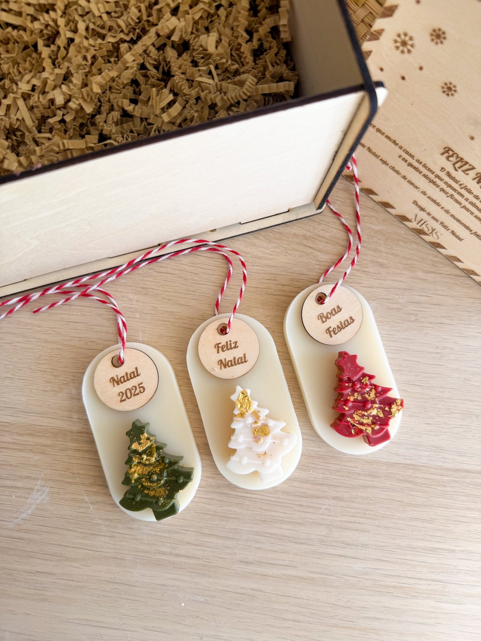 O trio de ambientadores é embalado com todo o cuidado numa caixinha de papel kraft, decorada com fio natalício e dois pendentes de madeira — uma bengala e um pendente redondo.