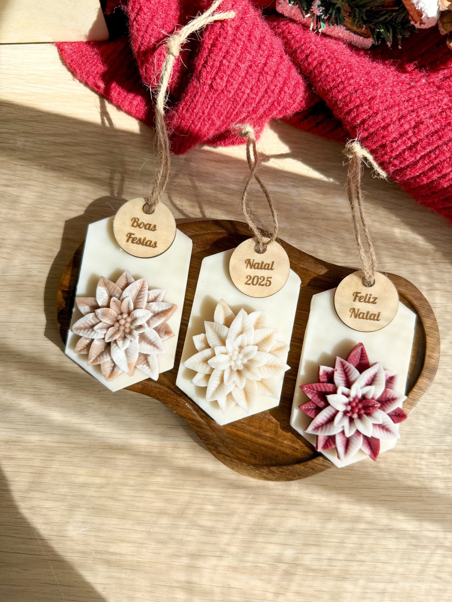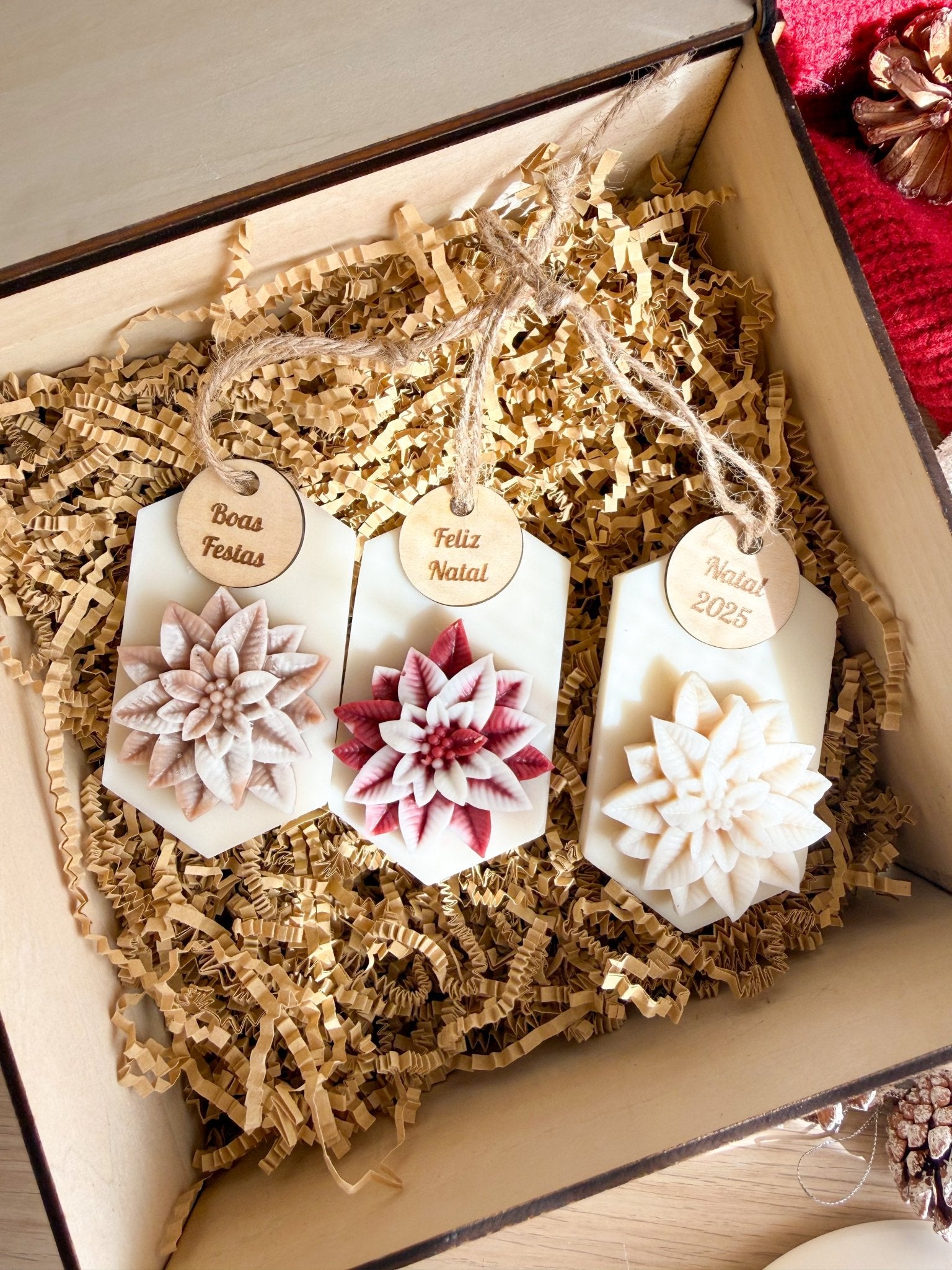 O trio de ambientadores é embalado com todo o cuidado numa caixinha de papel kraft, decorada com fio natalício e dois pendentes de madeira — uma bengala e um pendente redondo.