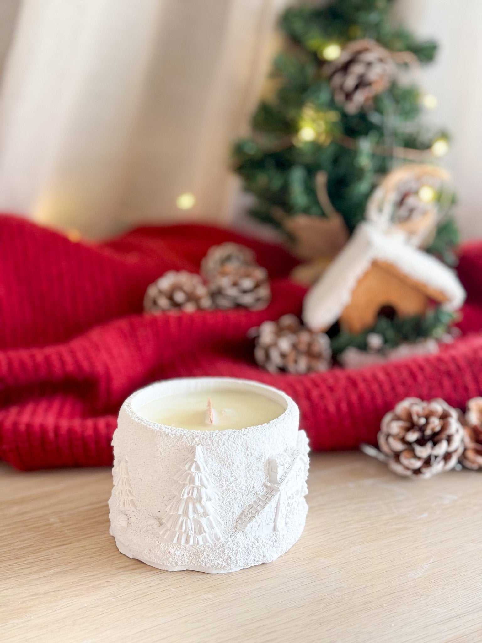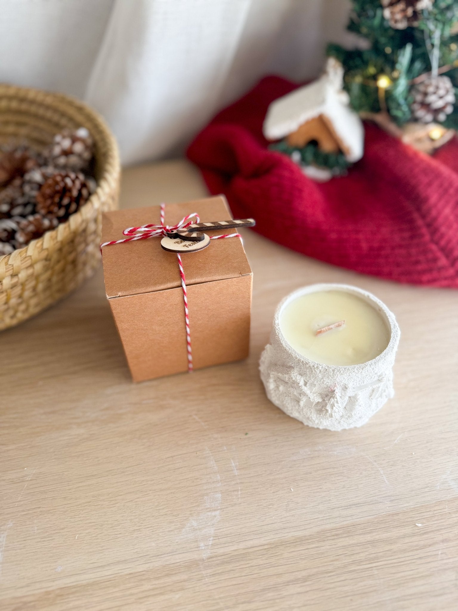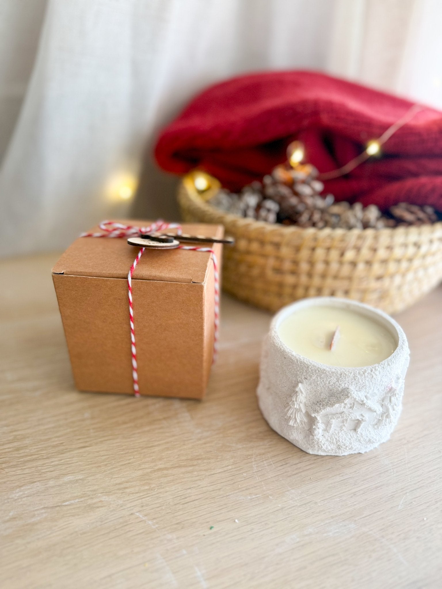 Cada vela é cuidadosamente embalada numa caixinha de papel kraft, decorada com fio de Natal e dois pendentes de madeira: uma bengala doce de Natal e um pendente redondo.